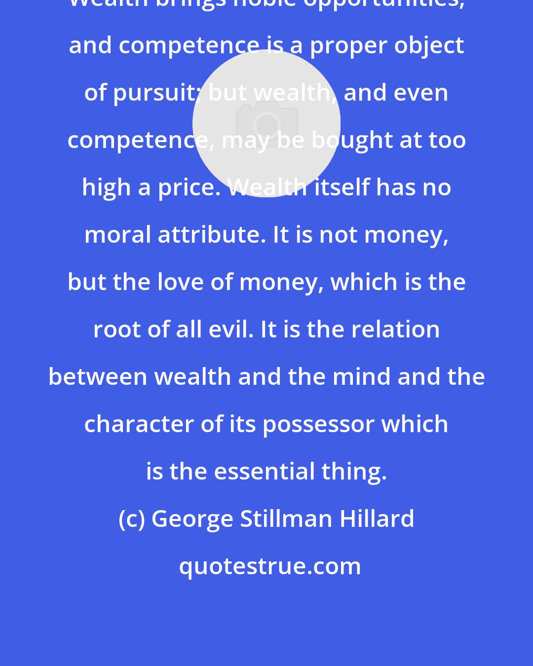 Wealth brings noble opportunities, and competence is a proper object of pursuit; but wealth, and even competence, may be bought at too high a price. Wealth itself has no moral attribute. It is not money, but the love of money, which is the root of all evil. It is the relation between wealth and the mind and the character of its possessor which is the essential thing.